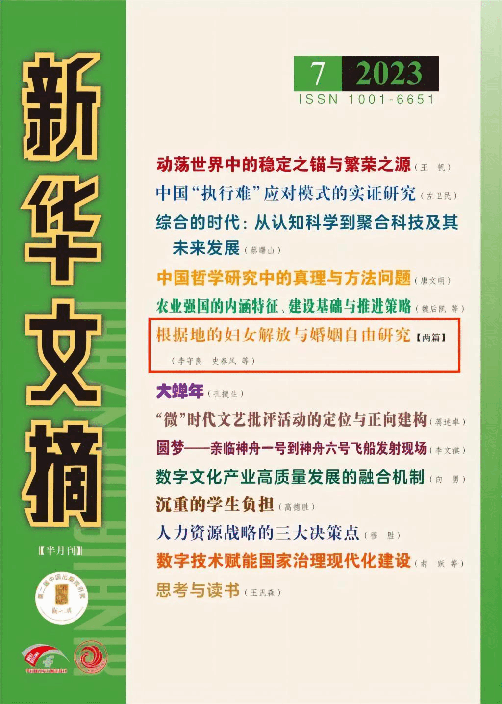 《新华文摘》2023年第7期全文转载了公司李守良副教授的《理想与现实:新民主主义革命时期根据地的婚姻自由立法》论文,并作为封面文章推荐。该文原刊于《贵州社会科学》2022年第11期。 《新华文摘》是由国家新闻出版...