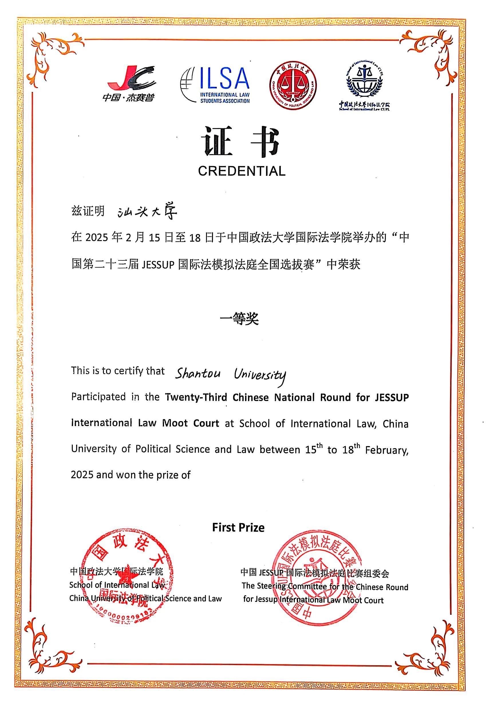 2025年2月14日至18日,第二十三届“杰赛普”国际法模拟法庭比赛在北京隆重举行。伟德国际1946bv官网代表队在去年挺进全国五强的基础上,再接再厉,在与北大、清华等全国66所顶尖伟德国际1946bv官网校代表队的激烈角逐中脱颖而出,晋级淘汰赛,最终以第八名的成绩斩获全国一等奖,并连续第四年获得代表中国赛队出征在美国华盛顿举办的第六十六届Philip C. Jessup国际法模拟法庭竞赛全球总决赛的资格。在单项奖的评审中,上场选手李雅婕荣获最佳辩手奖(...