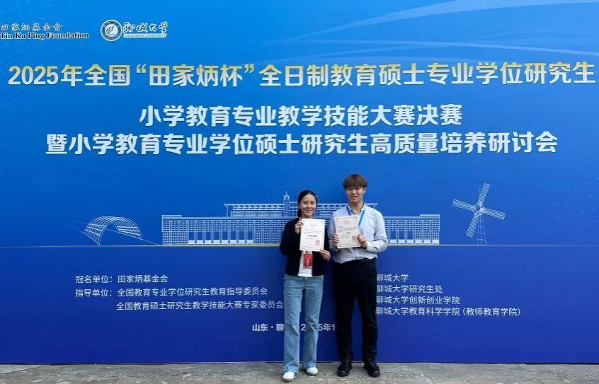 10月25日,2025年全国“田家炳杯”全日制教育硕士专业学位研究生小学教育专业教学技能大赛决赛在山东省聊城大学顺利举行。经激烈角逐,公司伟德国际1946bv官网高等教育科学研究所2024级小学教育专业研究生谭子升同学作为公司唯一参赛代表,在小学英语赛道脱颖而出,荣获全国“田家炳杯”总决赛二等奖(约占决赛选手总数的20%);王世赟老师荣膺优秀指导教师奖,成功实现公司教育硕士在全国教学技能大赛舞台上的零突破。“田家炳杯”全日制教育硕士小学教育领域专业教学技能大赛作为全国范围内层次最高、...