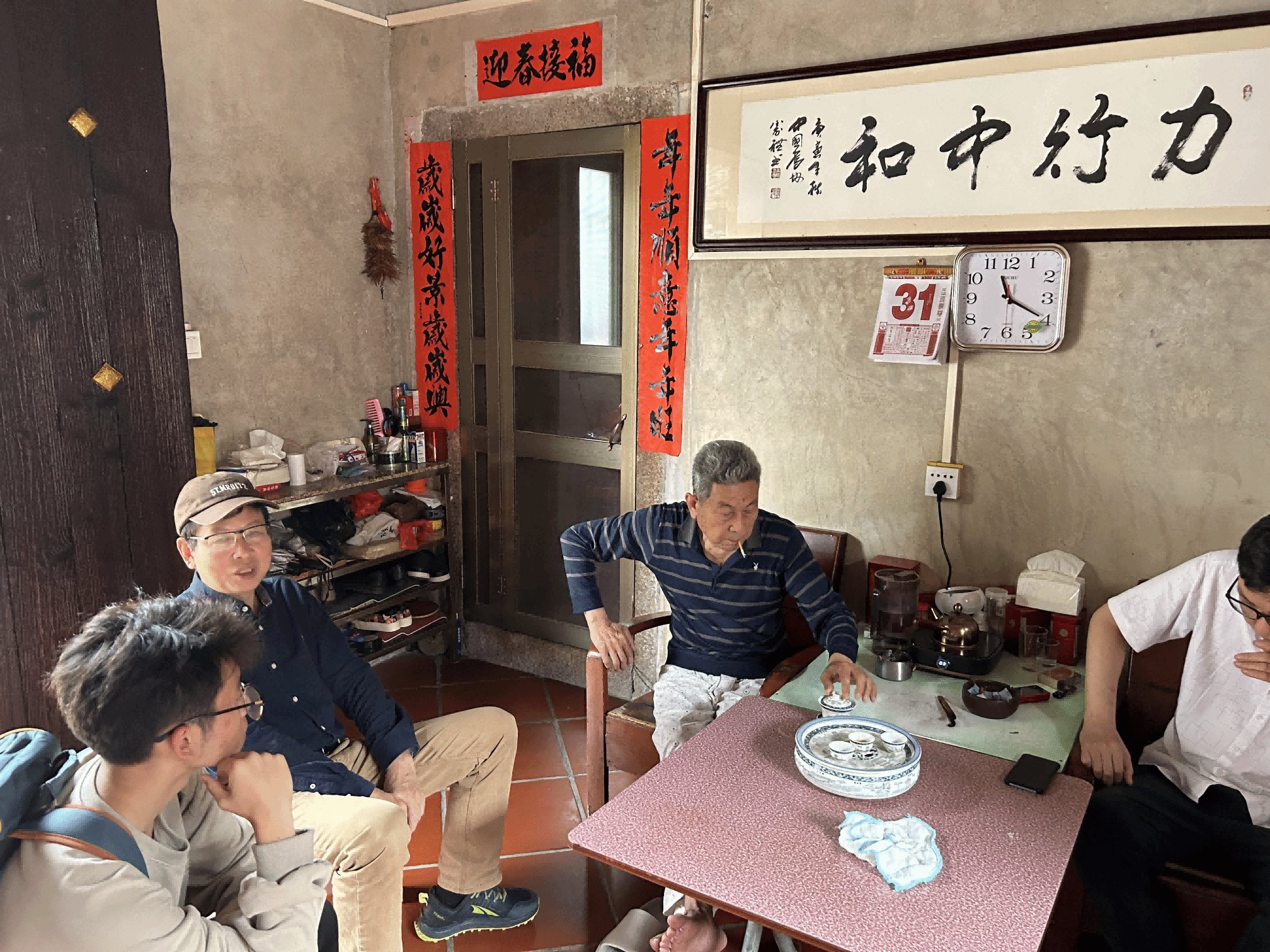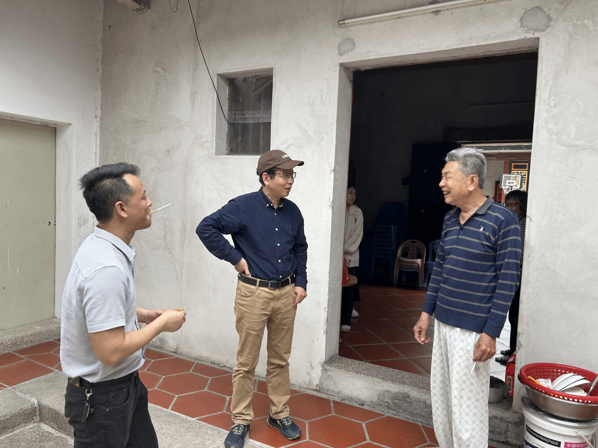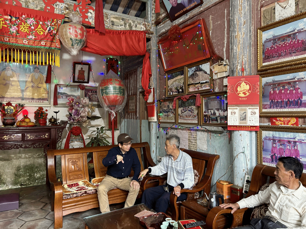 上午,研究中心师生陪同王春光研究员在雨中参观蓬洲东社区城隍庙和古渡口,走访多个宗亲祠堂,了解潮汕古村建筑特色形式和民间组织。下午,中心师生与王春光继续前往东湖村考察,参观学习了东湖“月德楼”侨博馆,入户访问了不同年龄层次的在村村民,深入探讨村民的流动状况、生计、侨民关系和往来情况等议题。期间,王春光乐此不疲地推进调研,朴实的问法贴近生活、反映现实关怀,营造出轻松和谐的调研氛围。