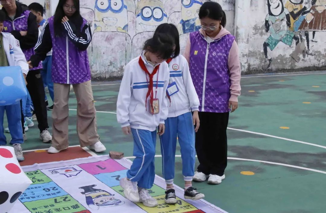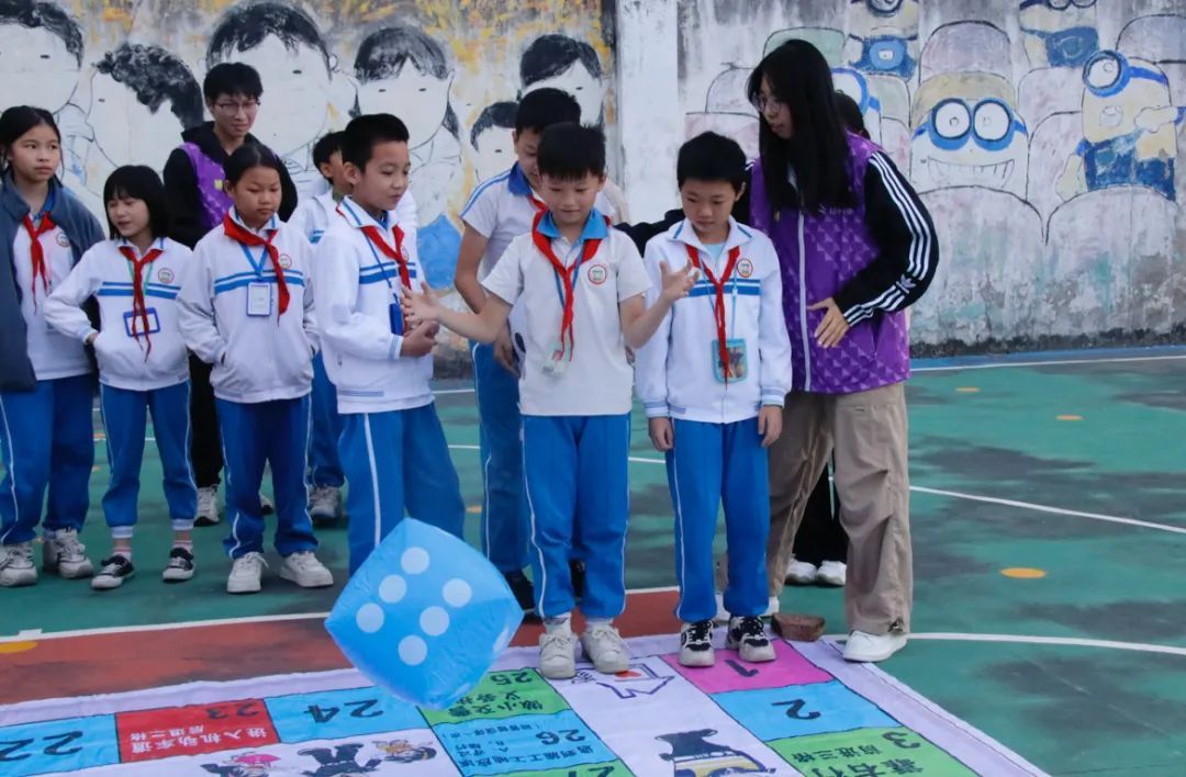 室内授课结束后,小朋友们在志愿者的引导下分成若干个小组,有序参与户外游戏。交通飞行棋游戏在篮球场进行,地面铺设大型游戏棋盘,小朋友们在志愿者的指引下投掷骰子,依照点数移动步数。在闯关过程中,小朋友们回答棋盘中各种交通安全问题,直至成功抵达终点赢得奖品,在游戏中学习交通安全法规,增强守法意识。