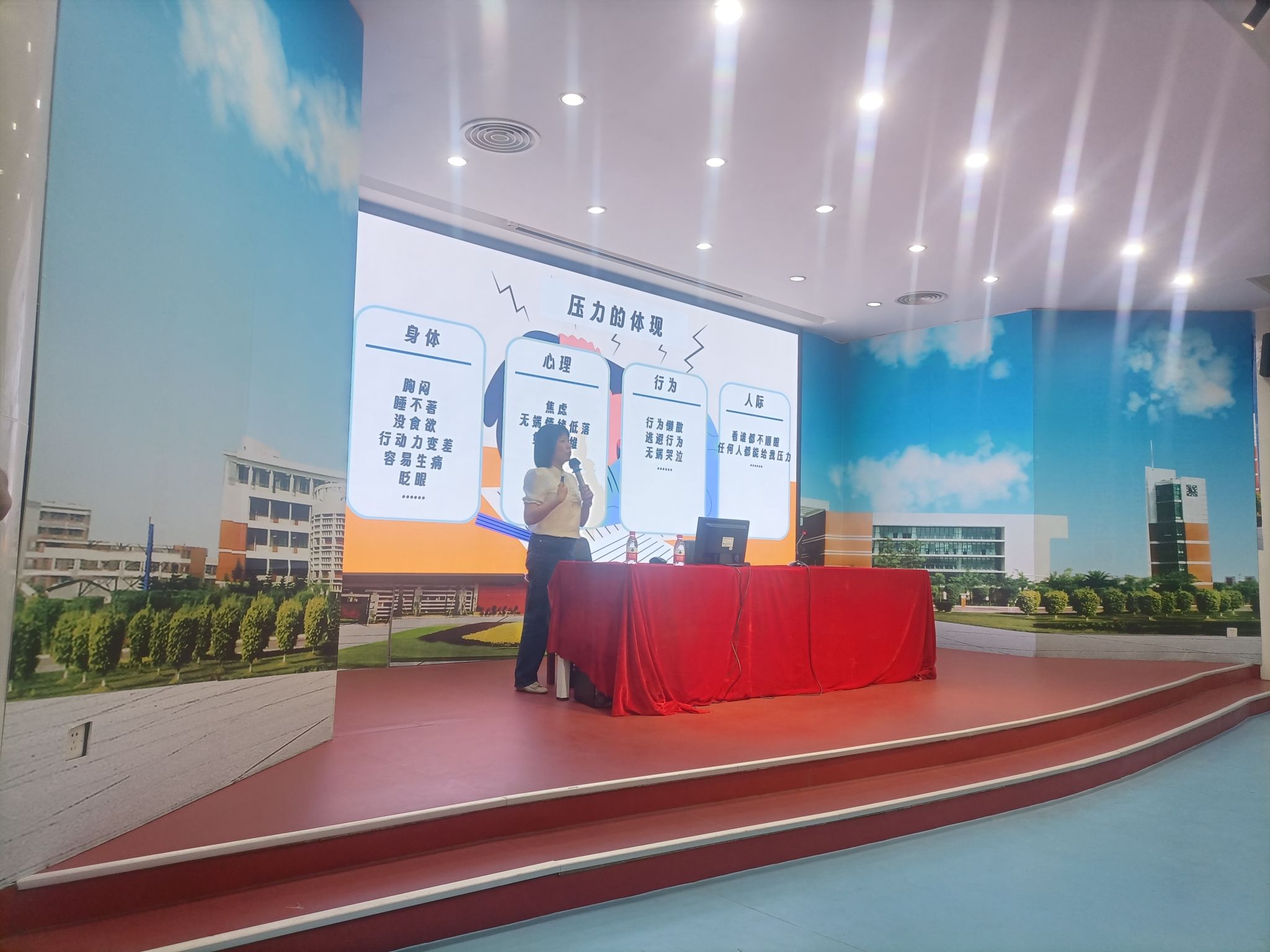 章妍怡老师详细了解各中学员工的实际情况,并结合员工的心理状态和实际诉求,设计授课课件。讲座中,章妍怡老师帮助同学们分析压力来源,并通过现场互动的形式,引导同学们缓解压力,帮助同学们找到和老师、同学、家长沟通的正确方式。同时,她还向同学们传授了很多心理解压“绝招”,让同学们在轻松愉快的氛围中缓解考前焦虑情绪,以更好的状态应对高考。