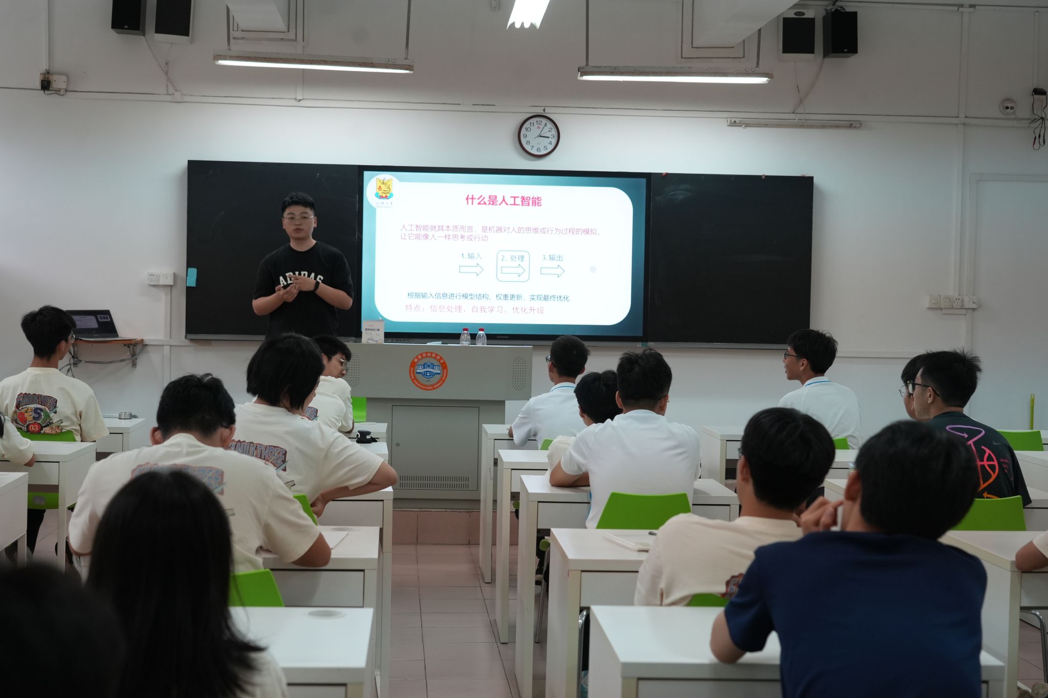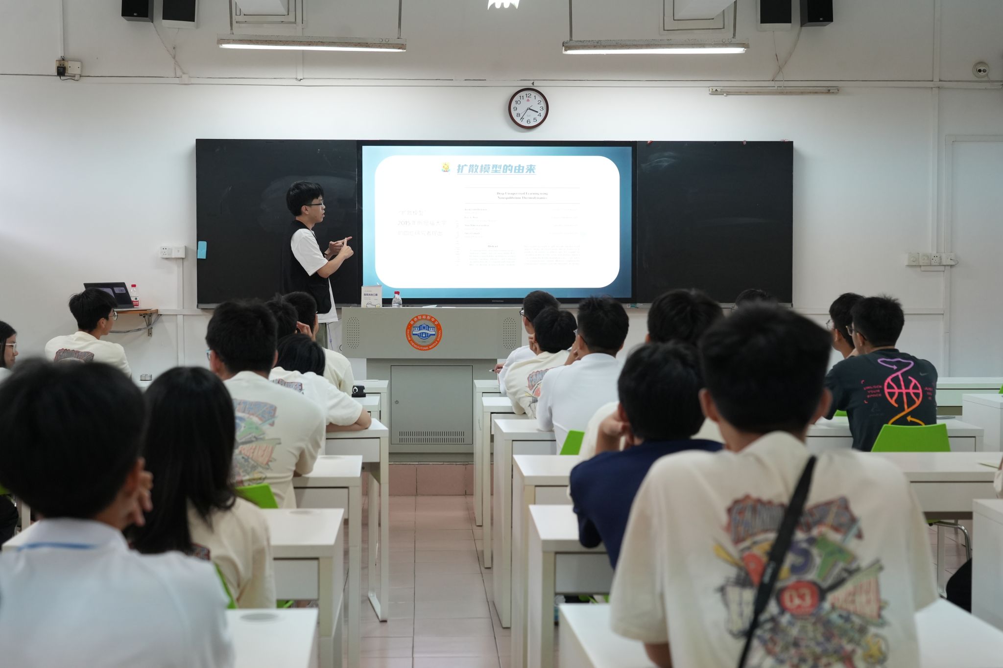 5月10日,在郑裕彤中学科技文化节上,邱昊从人工智能的基础知识出发,和同学们进行了融洽的现场问答互动,激发了中员工对人工智能学习的兴趣和动力。蔡兴圳介绍了当下最火的两个AIGC应用项目—文字生成图片和文字转语音,以及它们的算法原理(Diffusion模型和VITS模型),让同学们进一步认识和了解AI知识。