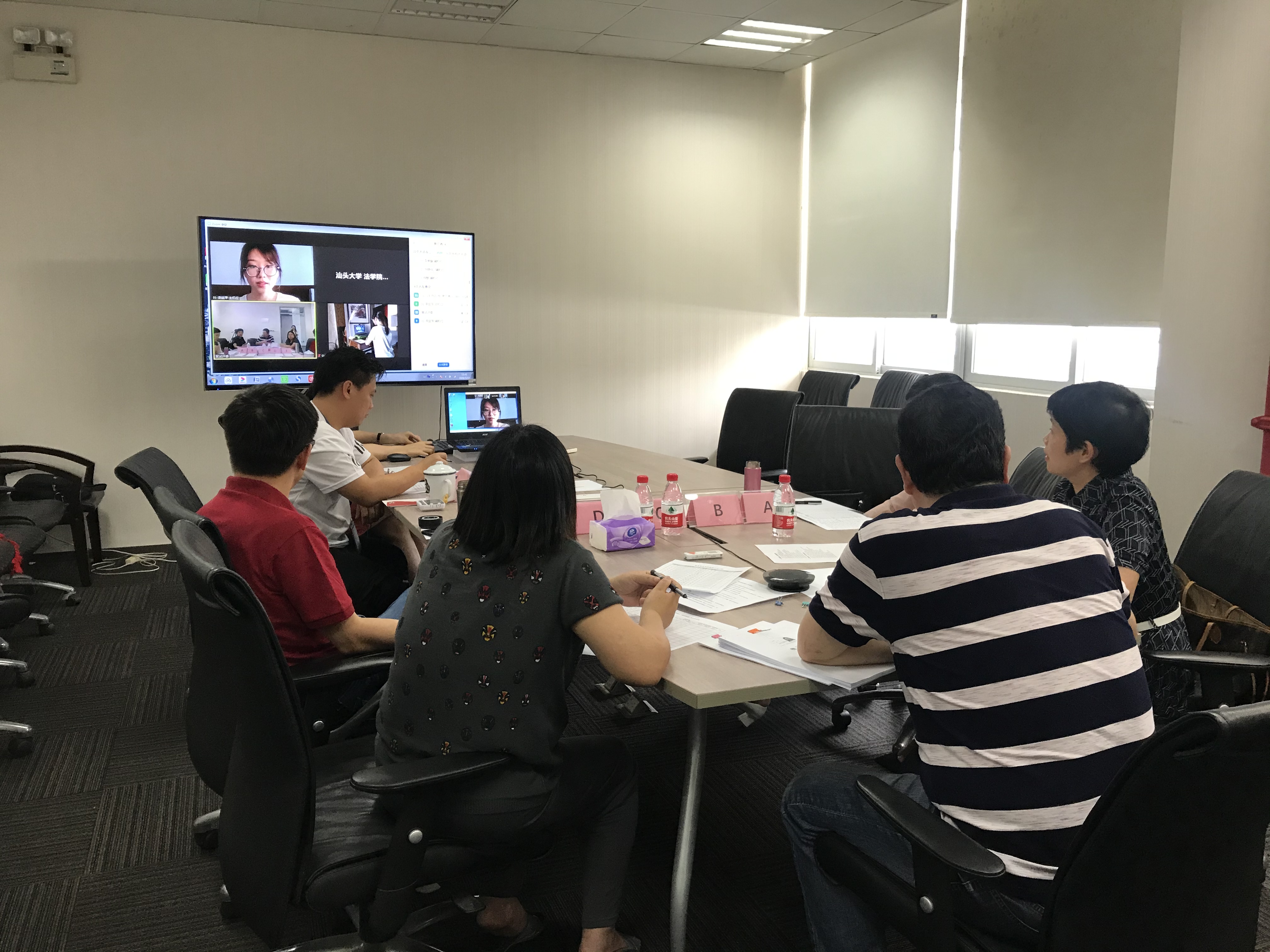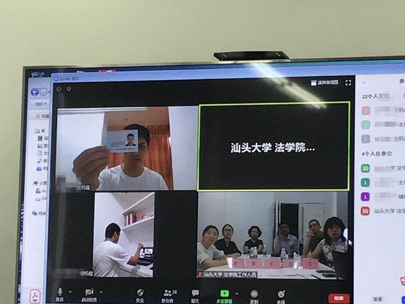 在复试现场,复试评委集中在会议室,考生在电脑远程端,师生通过“ZOOM视频会议平台”进行复试,现场秩序井然,衔接顺畅。复试采取“双机位”“双秘书”模式:“第一机位”用于考生面试考核,“第二机位”采集考生“第一机位”显示器及考生所处环境的整体情况,用于监考;每个复试小组设专职秘书2人,对会场准备、资格审查、线上会议室管理、线上抽签、复试记录、双机位监考等工作进行分工。复试过程中,考生按次序逐一进入“视频考场”,会议秘书再次核验考生身份,监察远程环境。考生完成英语水平测试和专业知识、综合素质测试等考核内容,结束后离开考场。