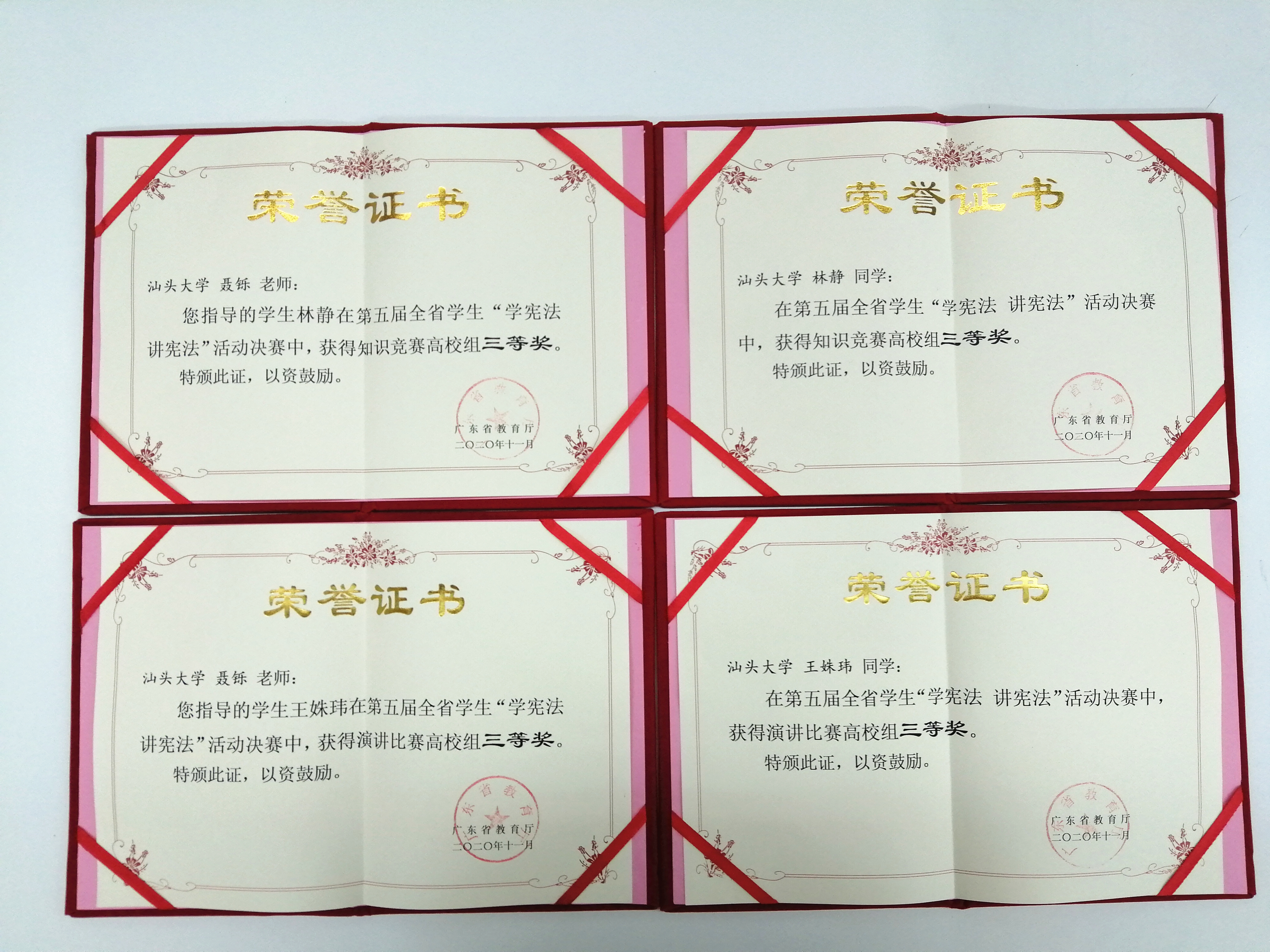 在广东省教育厅组织开展的第五届全省员工“学宪法讲宪法”活动中,公司师生积极参与,在法律系聂铄老师的指导下,2019级法学专业林静同学荣获宪法法治知识竞赛三等奖,2018级法学专业王姝玮同学荣获“学宪法,讲宪法”演讲比赛三等奖。