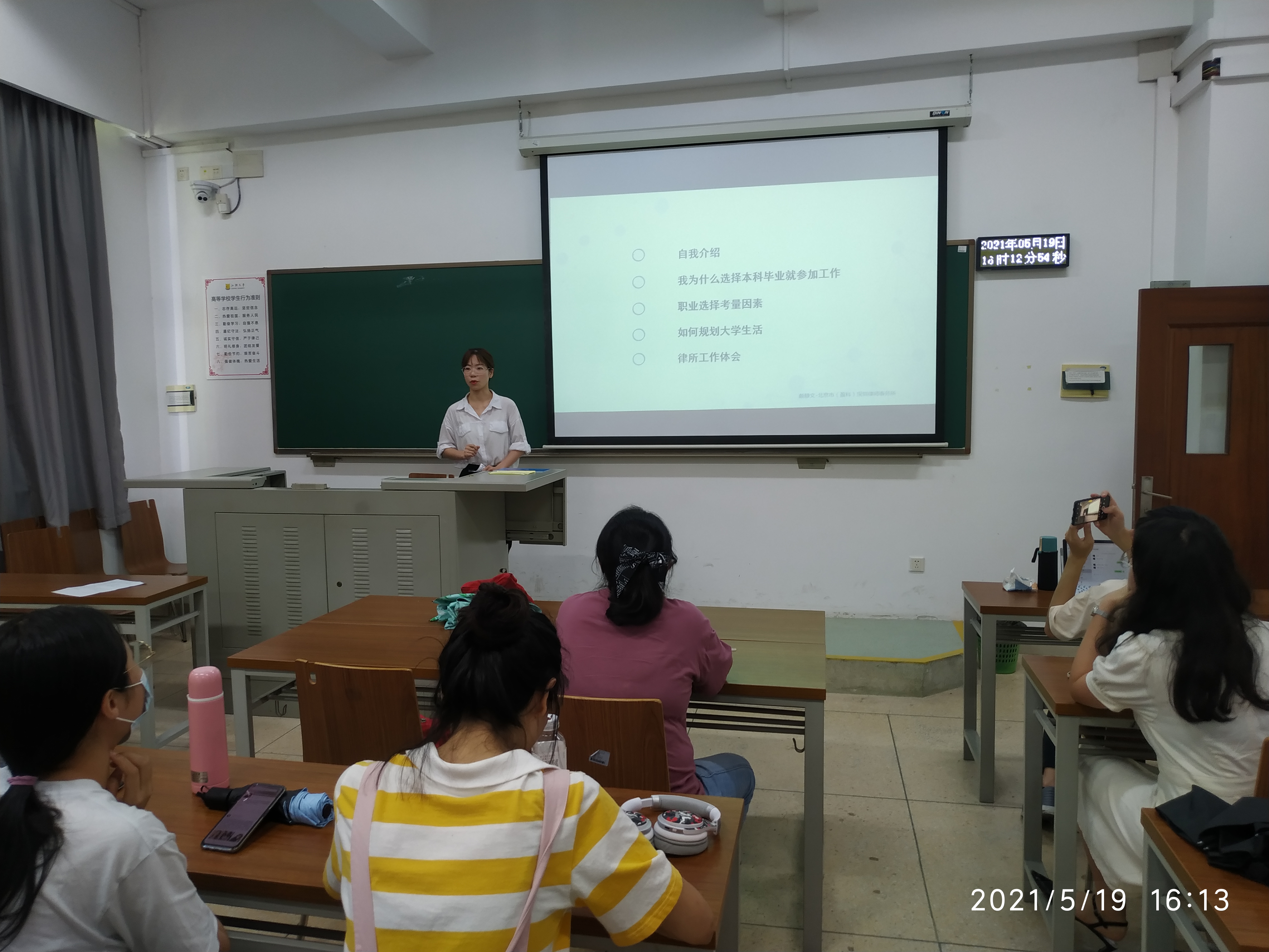 会上,法律系陈瑞林主任发表了简短讲话,并寄语同学们“德法兼修”。毕业生代表们根据自身经历和感悟心得做出了详尽而全面的分享。保研至华东政法大学和暨南大学的何珊与吴家烨着重从保研流程、面试准备、导师选择等方面讲解了在推免过程中的重点事项;考研成功的朱海彬、朱美豫两位同学则分享了计划制定、复习方法、答题技巧等方面的经验;成功申请澳门大学的甘秋怡则从程序、备考两个方面为大家做了申学示范;已成功签约就业的同学则向大家讲述了应聘技巧与心态。
