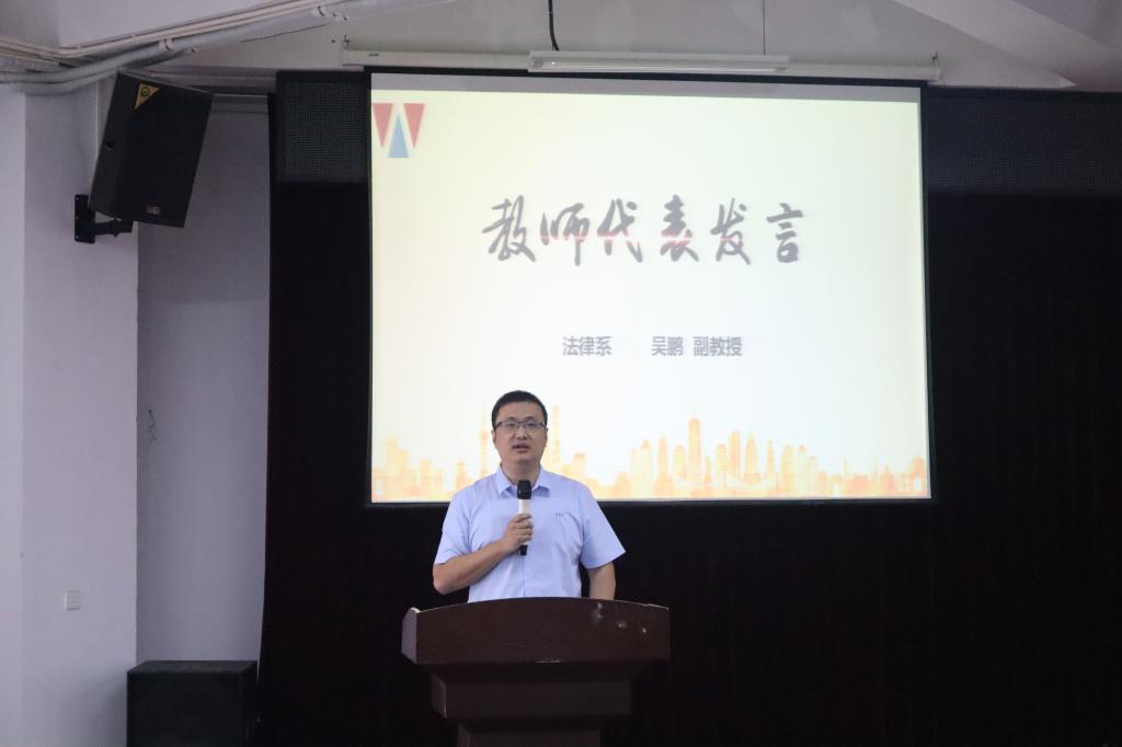 法律系吴鹏副教授作为教师代表上台发言。他告诉同学们要认清大学的学习任务,将学到的知识内化为智慧并用以指导实践,努力成为勇于创新的法学家;要守好法学这意识形态领域的第一道防线,坚定共产主义信仰和理想,顽强学习,坚决斗争;要努力做一个做大学问的人,永不退缩,不辜负这个伟大的时代。
