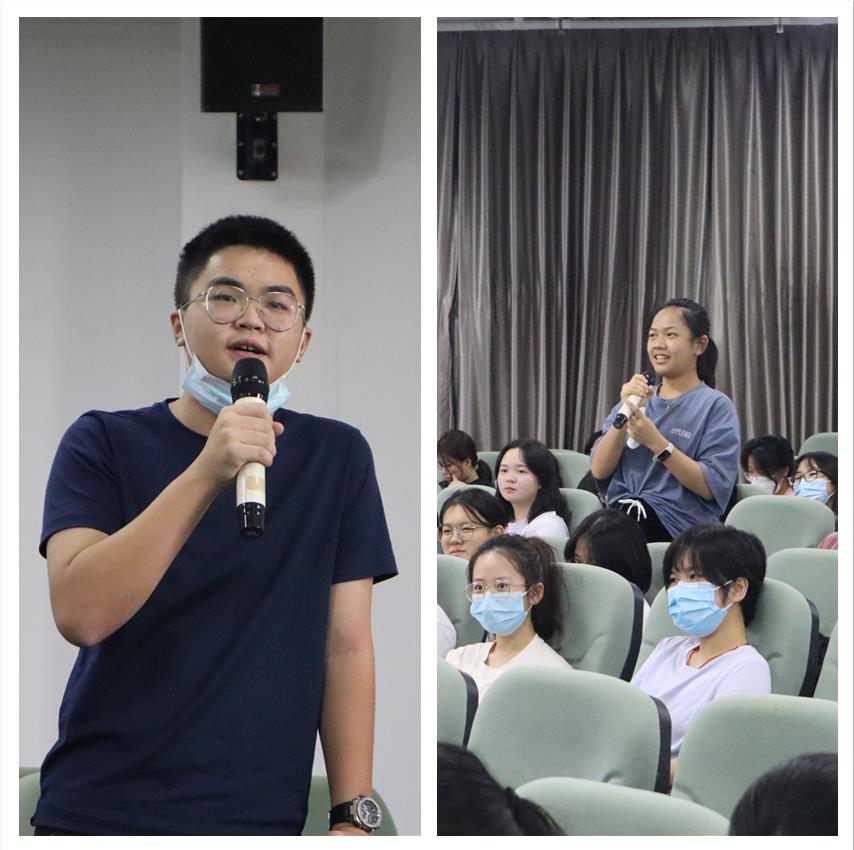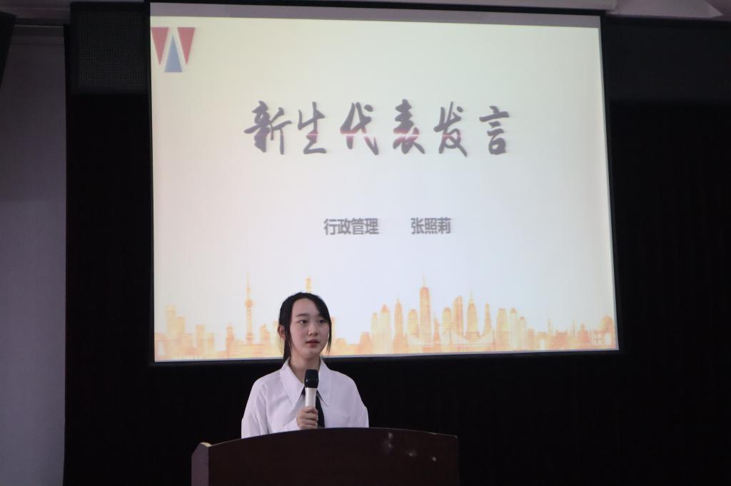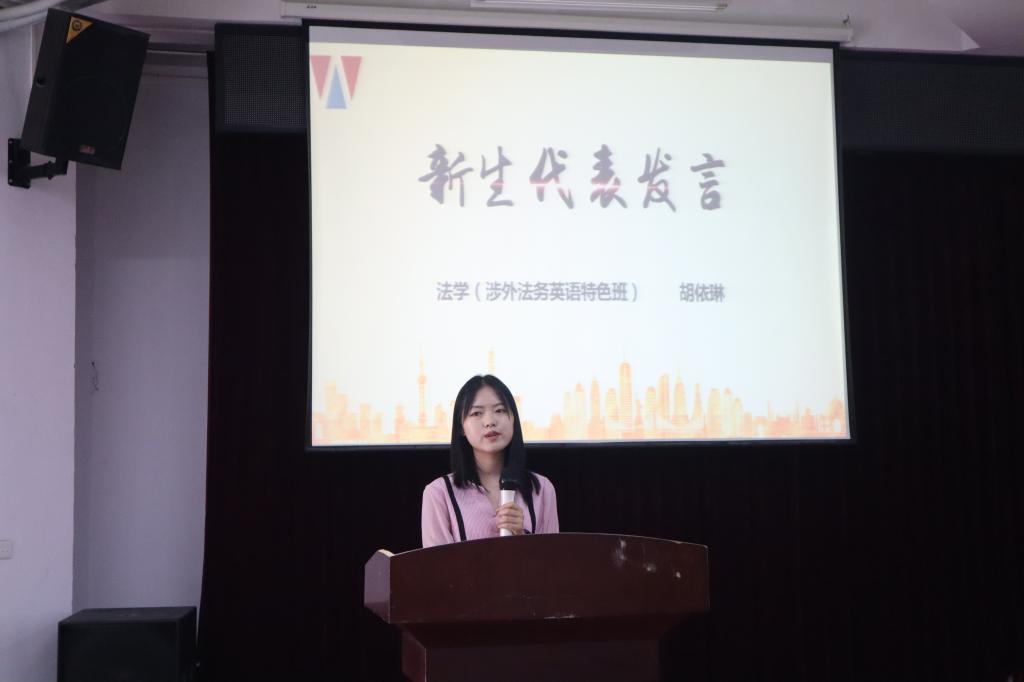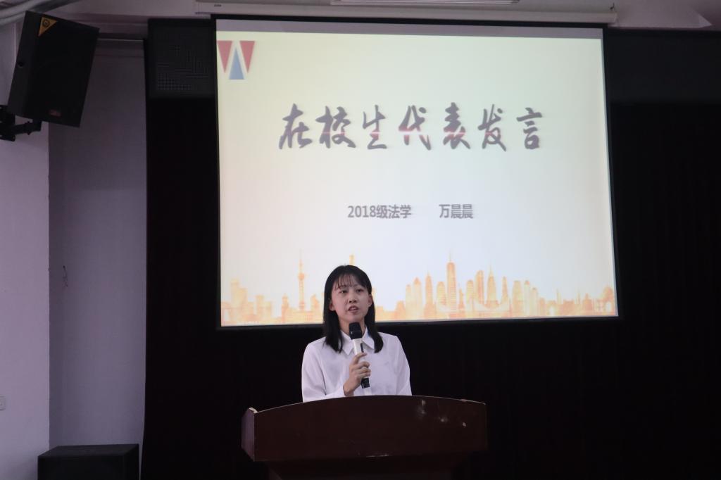 2018级法学专业的万晨晨代表优秀在校本科生发言,她分享了自己的学习、成长经验,鼓励新同学珍惜公司提供的优质平台,不断夯实学问、学以致用,建立自我、追求无我。随后,两个专业的新生代表胡依琳、张照莉先后上台分享了被汕大录取后的心境,同时也表达了对未来老员工活的期待,决心向优秀的师兄师姐看齐,刻苦学习,努力为公司增光添彩。
