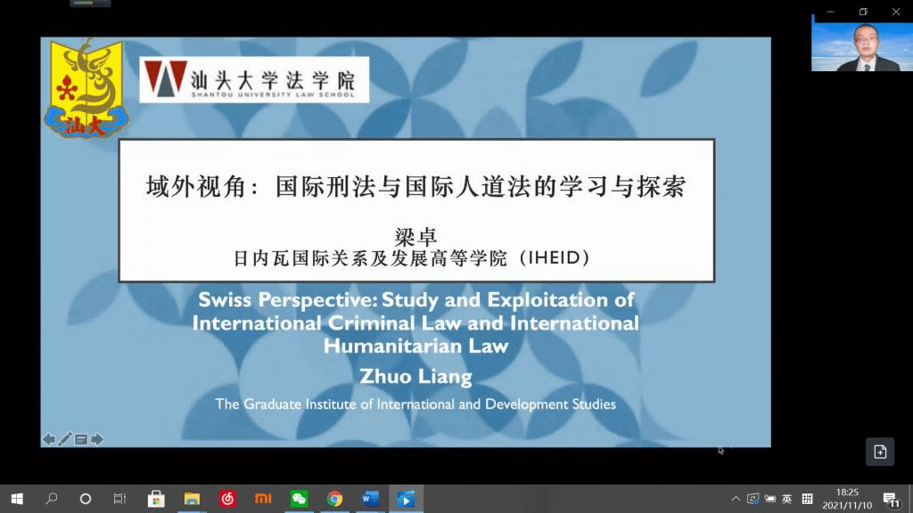 2021年11月10日下午14时30分,“涉外法律人才培养”系列讲座(第一期)以线上形式成功举办。本次讲座主题为“域外视角:国际刑法和国际人道法的学习与探讨”,由来自日内瓦国际关系及发展高等公司(IHEID)的梁卓博士担任主讲人,伟德国际1946bv官网郭旭阳老师担任主持人。梁博士曾在红十字国际委员会东亚代表处、国际刑事法院、联合国国际法委员会实习,并担任国际刑事法院模拟法庭(英文赛)法官。