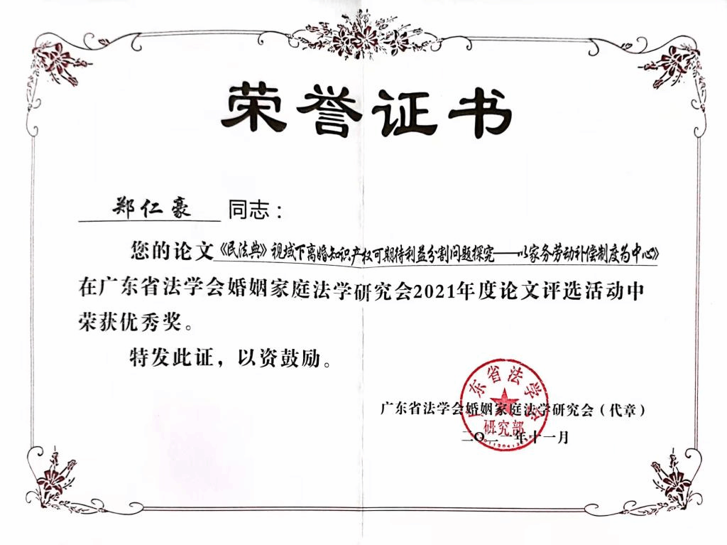 3.郑仁豪同学的论文《民法典视域下离婚知识产权可期待利益分割问题探究——以家务劳动补偿制度为中心》荣获优秀奖。