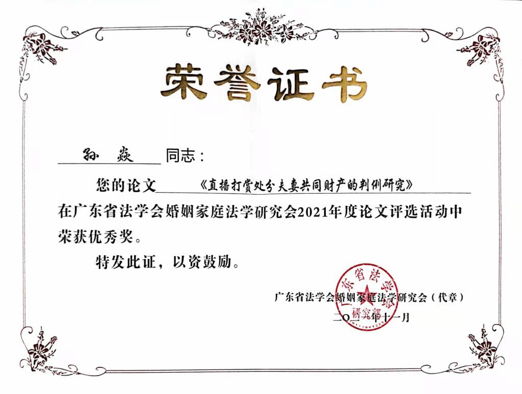 2.孙焱同学的论文《直播打赏处分夫妻共同财产的判例研究》荣获优秀奖;