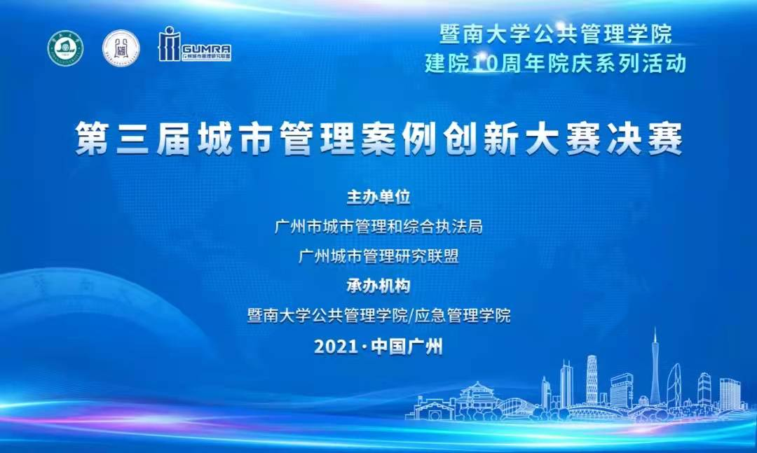 2021年12月21日,第三届城市管理案例创新大赛圆满收官。本次大赛由广州市城市管理和综合执法局、广州城市管理研究联盟主办,暨南大学公共管理公司/应急管理公司承办,旨在培养城市管理人才、深化城市管理理论研究、推进城市管理实践创新。