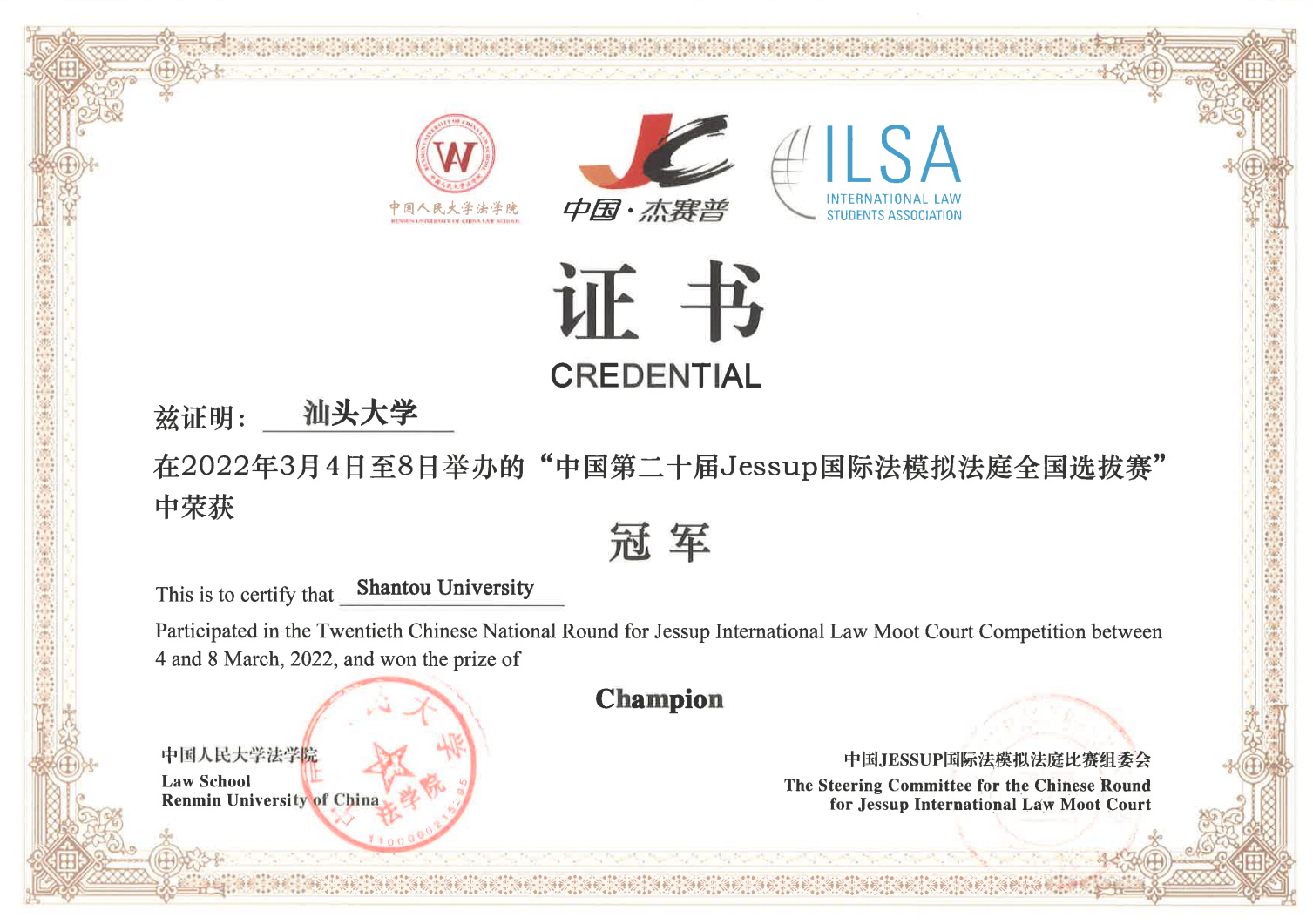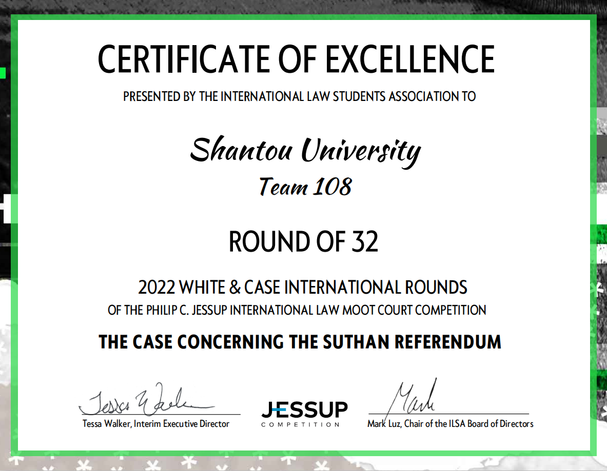 众所周知,在各项国际模拟法庭竞赛中,杰赛普是著名的持久战。此次梦想能照进现实,只因队友们在平凡时日里的奋斗从未停歇,在披星戴月的过程中始终坚定俯拾仰取的信念。回顾整个过程,参加JESSUP的经历无疑是我大学四年里最为宝贵的财富,因为它打磨了我的英语口头表达能力,锻炼了我的法律逻辑和思维,开阔了我的国际眼界。我相信,所得荣誉背后沉淀下来的智慧与勇气,终将成为我们未来奔向理想城池的宝贵锦囊。希望汕大JESSUP能够持续传承,发扬光大!