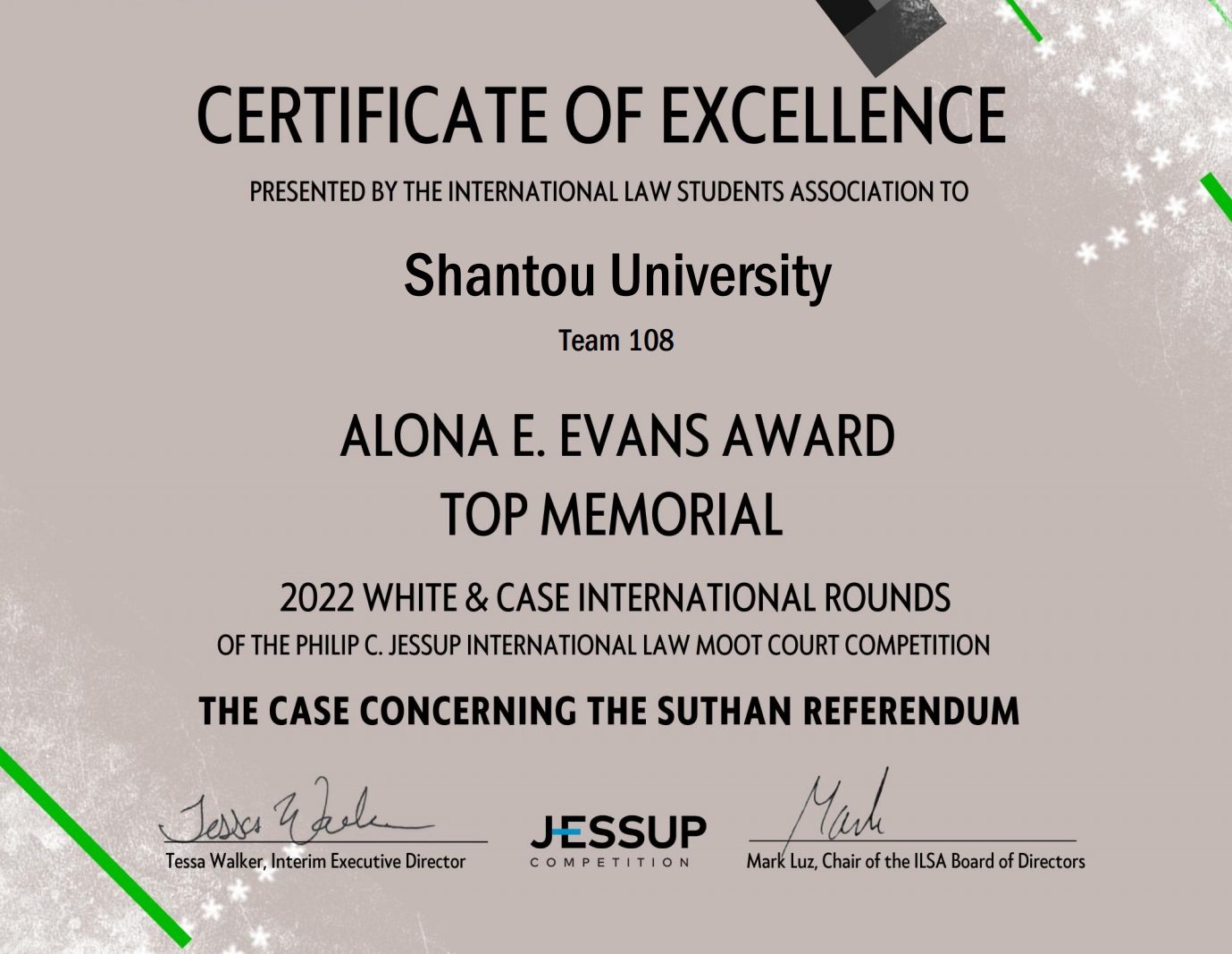 同时,汕大代表队稳定发挥传统书状写作优势,所撰书状得到组委会高度认可,荣获AlonaE. Evans最佳综合书状奖(全球前20名)。