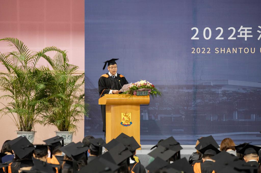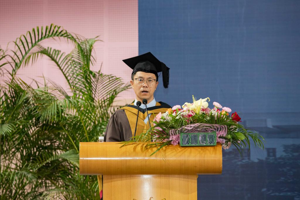 法律系金牌教练古俊峰博士作为教师代表发言,他鼓励同学们承理性、担良知,但行好事,便是值得骄傲的汕大人,最后他寄语同学们不忘来时初心,一路逐光而行!