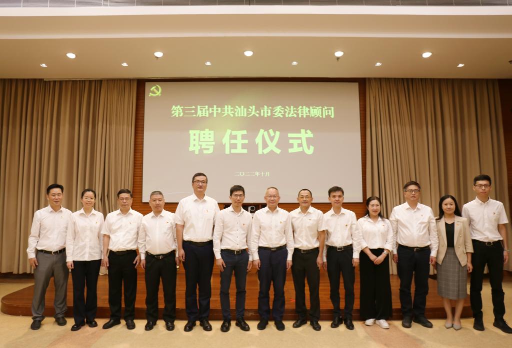 会议听取了市委法律顾问关于进一步做好法律顾问工作、推进法治汕头建设的意见建议,研究做好第三届市委法律顾问有关工作。市委副书记、秘书长赖小卫向市委法律顾问颁发聘书并讲话,他充分肯定了前两届法律顾问为市委科学民主依法决策付出的努力与贡献的智慧,向受聘的第三届市委法律顾问表示祝贺,并就进一步做好法律顾问工作提出意见和要求。