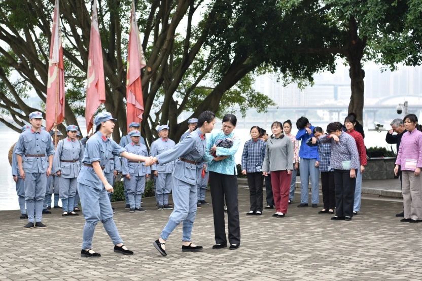 在中央红军长征出发地旧址于都县城东门渡口,教师们观看了情景剧《送别》,党和人民的鱼水情让老师们眼角湿润,深受感动。