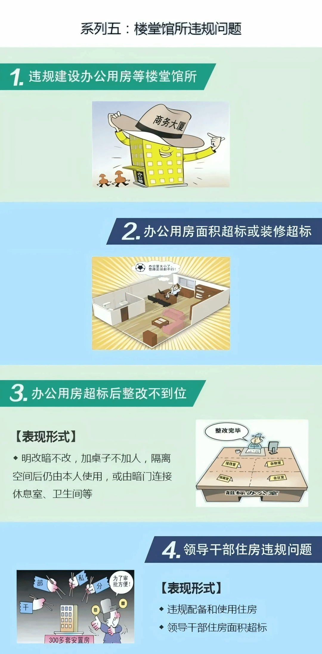 6.其他(包括6种表现:违规配备和使用公车、楼堂馆所问题、提供或接受超标准接待、组织或参加用公款支付的高消费娱乐健身等活动、接受或提供可能影响公正执行公务的健身娱乐等活动、违规出入私人会所、领导干部住房违规)。