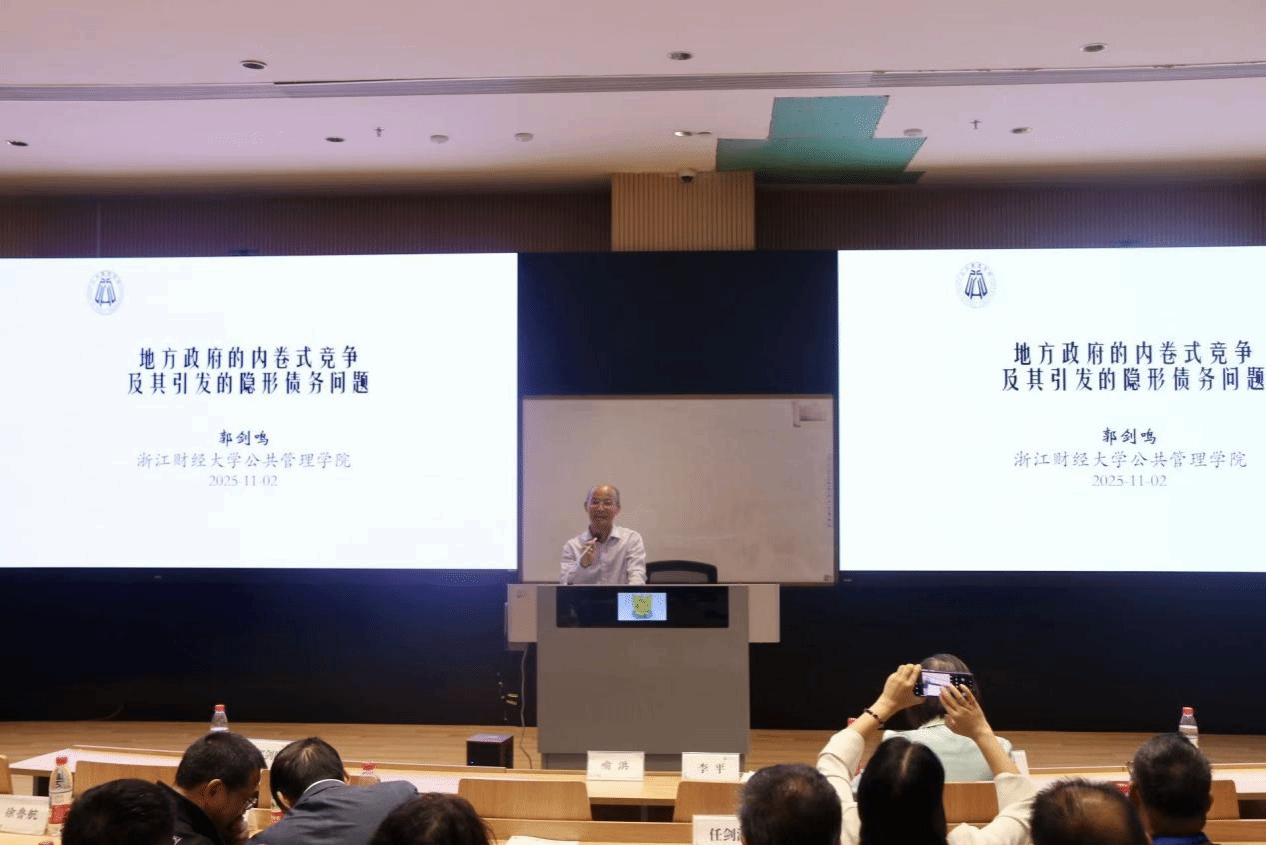 浙江财经大学名誉经理郭剑鸣教授以《地方政府的内卷式竞争、内卷式治理及其引发的债务问题》为题,系统梳理了地方政府在发展竞争中陷入内卷的表现形态,深入分析了内卷式治理对资源配置效率、公共服务质量的负面影响,并结合多地案例揭示了内卷化趋势与地方政府债务膨胀之间的传导机制,提出了优化考核体系、规范竞争秩序、化解债务风险的综合对策。