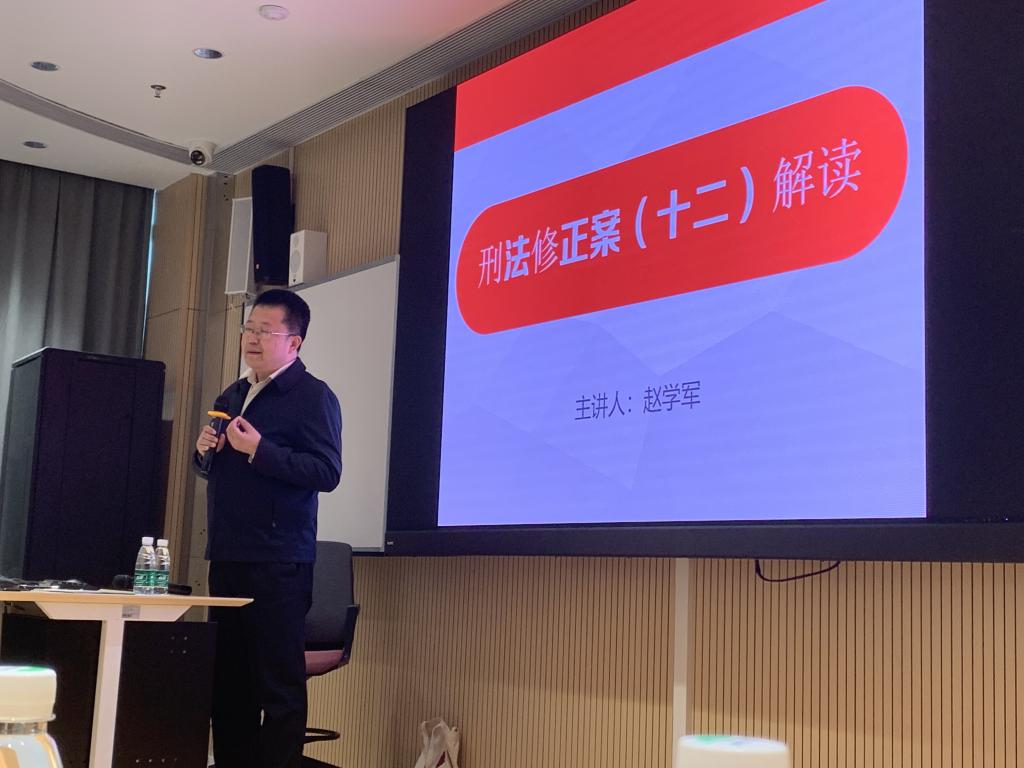 赵老师曾在法院从事刑事审判工作十余年,担任过刑事审判庭副庭长、审判委员会委员,具有深厚的理论功底和丰富的实践经验。本次讲座围绕“适时修改刑法的必要性”、“刑法修正案(十二)起草工作过程和基本考虑”、“刑法修正案(十二)修改主要内容”及“刑法修正案(十二)全文”四个部分展开。刑法修正案(十二)主要涉及“加大对行贿犯罪的惩治力度”和“增加惩治民营企业内部人员腐败相关犯罪”两个方面,赵老师根据修正案的内容逐条进行分析,深入浅出,引人入胜。