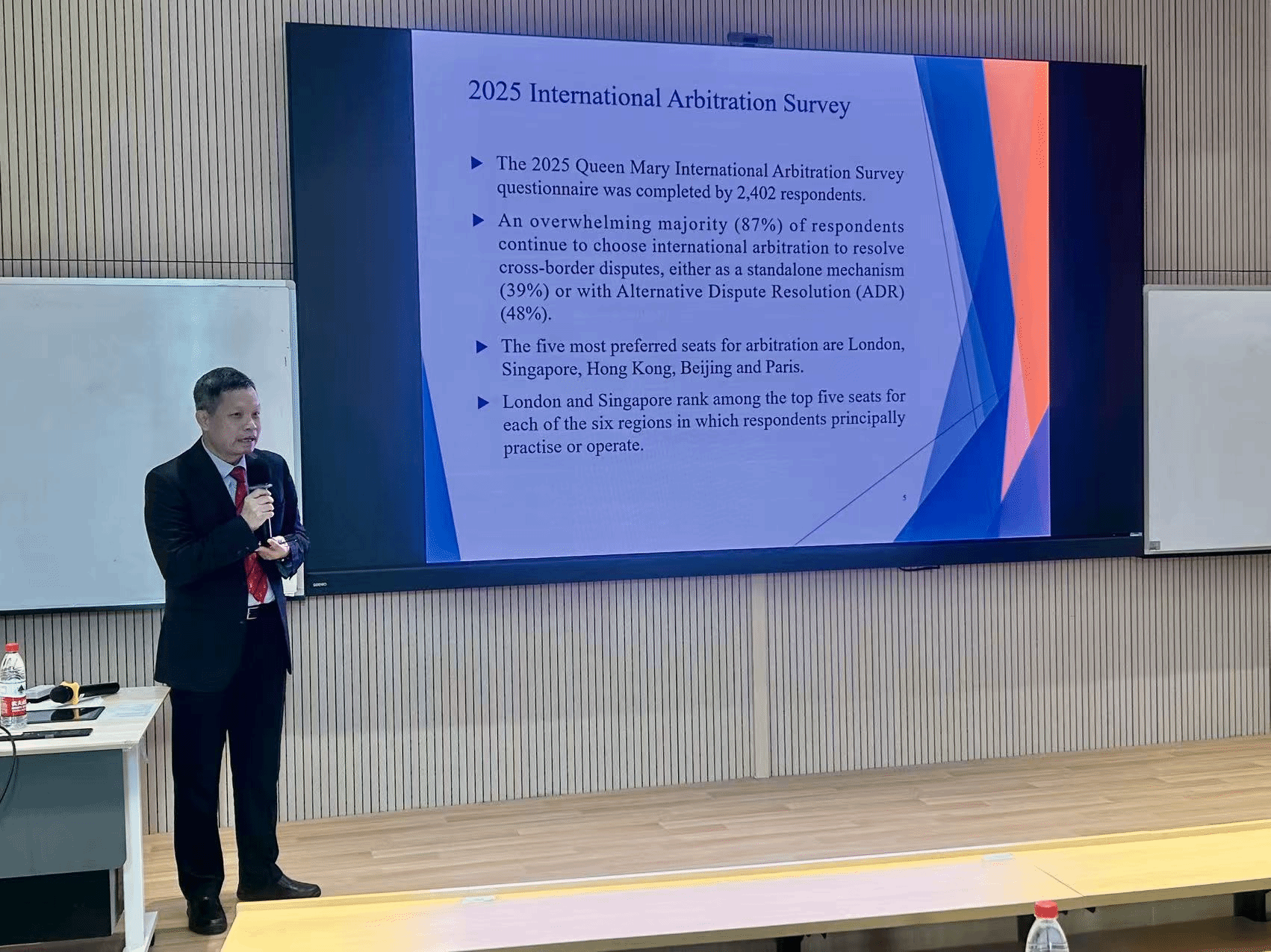 第一场讲座由周立新大律师主讲,主题为“国际仲裁与调解的协同运作”。他从实务角度深入剖析了两种争议解决机制的互补与融合,指出仲裁的优势在于终局性与专业性,而调解更注重关系维护与共赢结果。在跨境商事争议中,二者结合形成的“仲裁-调解”(Med-Arb)混合机制,正成为高效解纷的重要趋势。