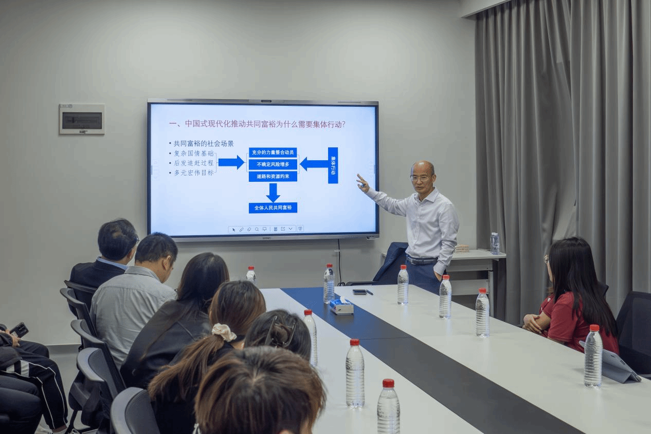 在第二场讲座中,郭剑鸣教授结合其深厚的公共管理学术积淀,围绕“中国式现代化推进全体人民共同富裕的中轴逻辑及其建构”展开系统阐释。他从中国式现代化的本质要求出发,深入剖析共同富裕的核心内涵,重点解读推进共同富裕的中轴逻辑架构,并结合实践案例探讨具体建构路径,为在场师生带来一场深刻的学术启发。
